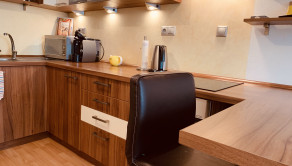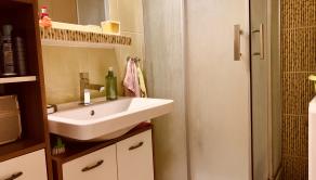 .: Byt je po kompletnej rekonštrukcii vo veľmi dobrom stave (viď fotogaléria) rozumne predelený priečkou na 1,5 izbový byt. Je oddelená spálňa a obývacia časť s kuchyňou. Kuchynská linka je nová s barovým pultom. V spálni a aj v predsieni sa nachádzajú vstavané skrine, bodové svetlá. Sanita je so sprchovacím kútom a byt má samostatné WC. Do bytu sa vstupuje cez pavlač cez protipožiarne dvere a vlastník si dal zabudovať ešte aj bezpečnostné dvere pre zvýšenie bezpečnosti.